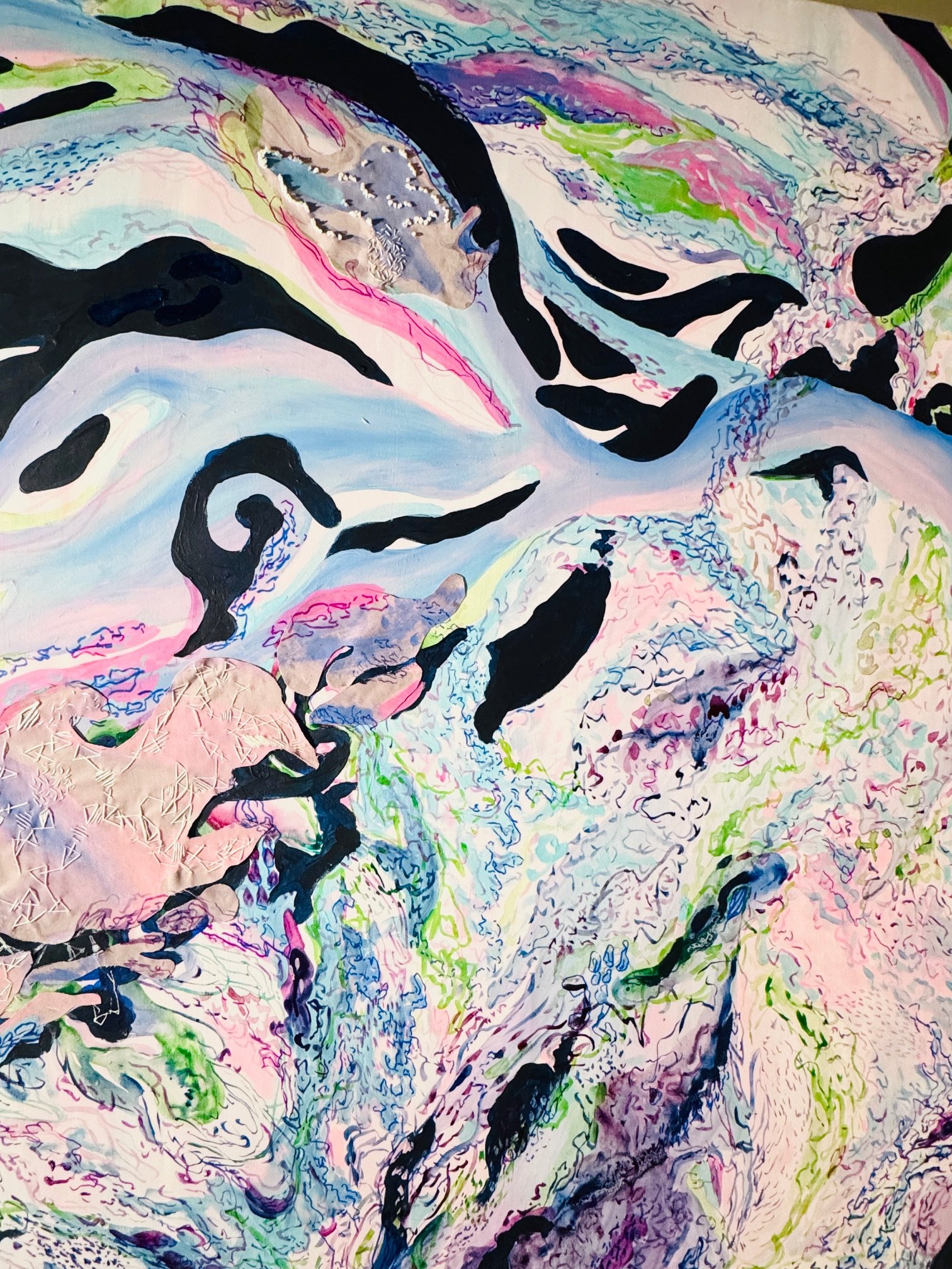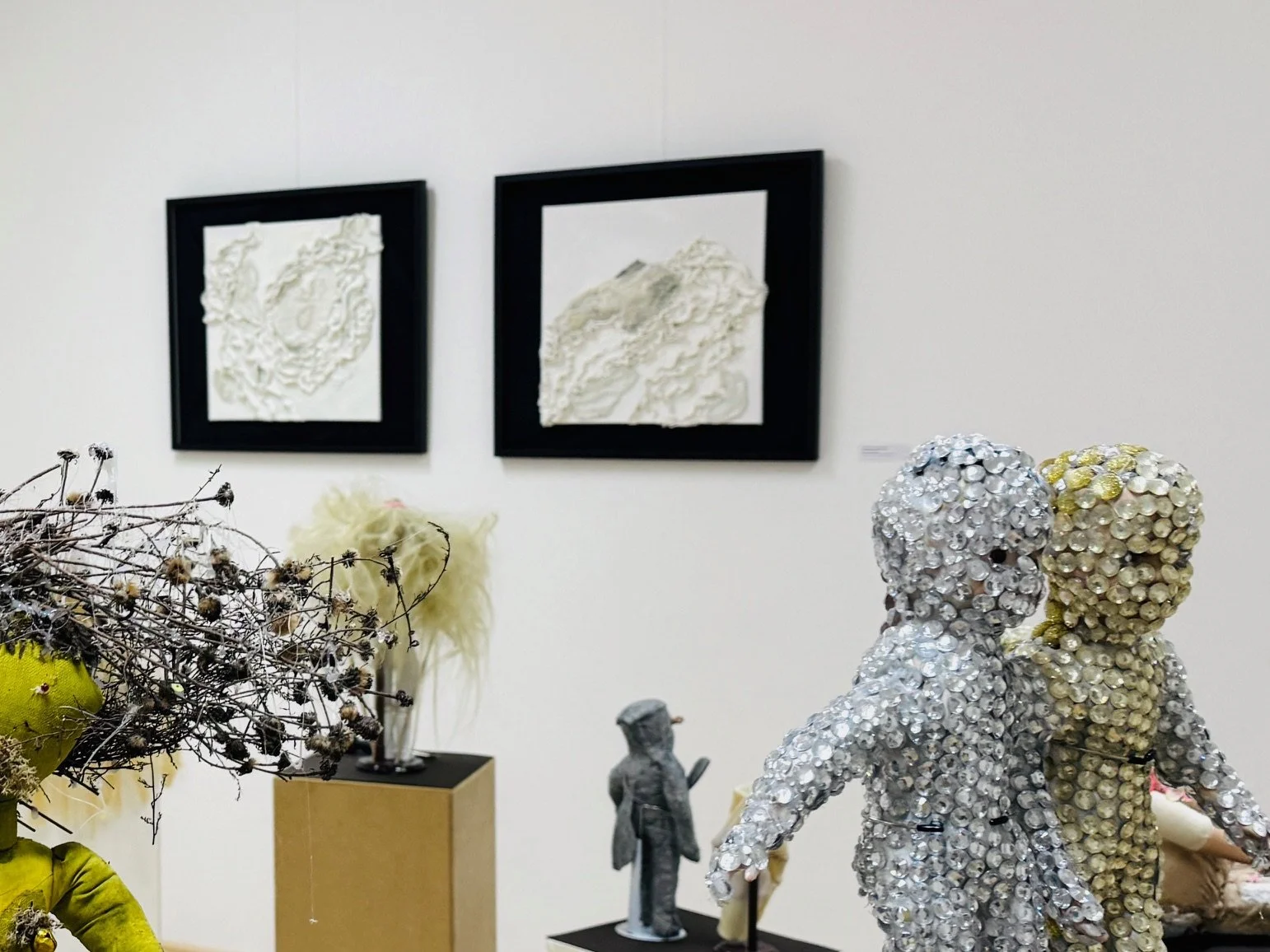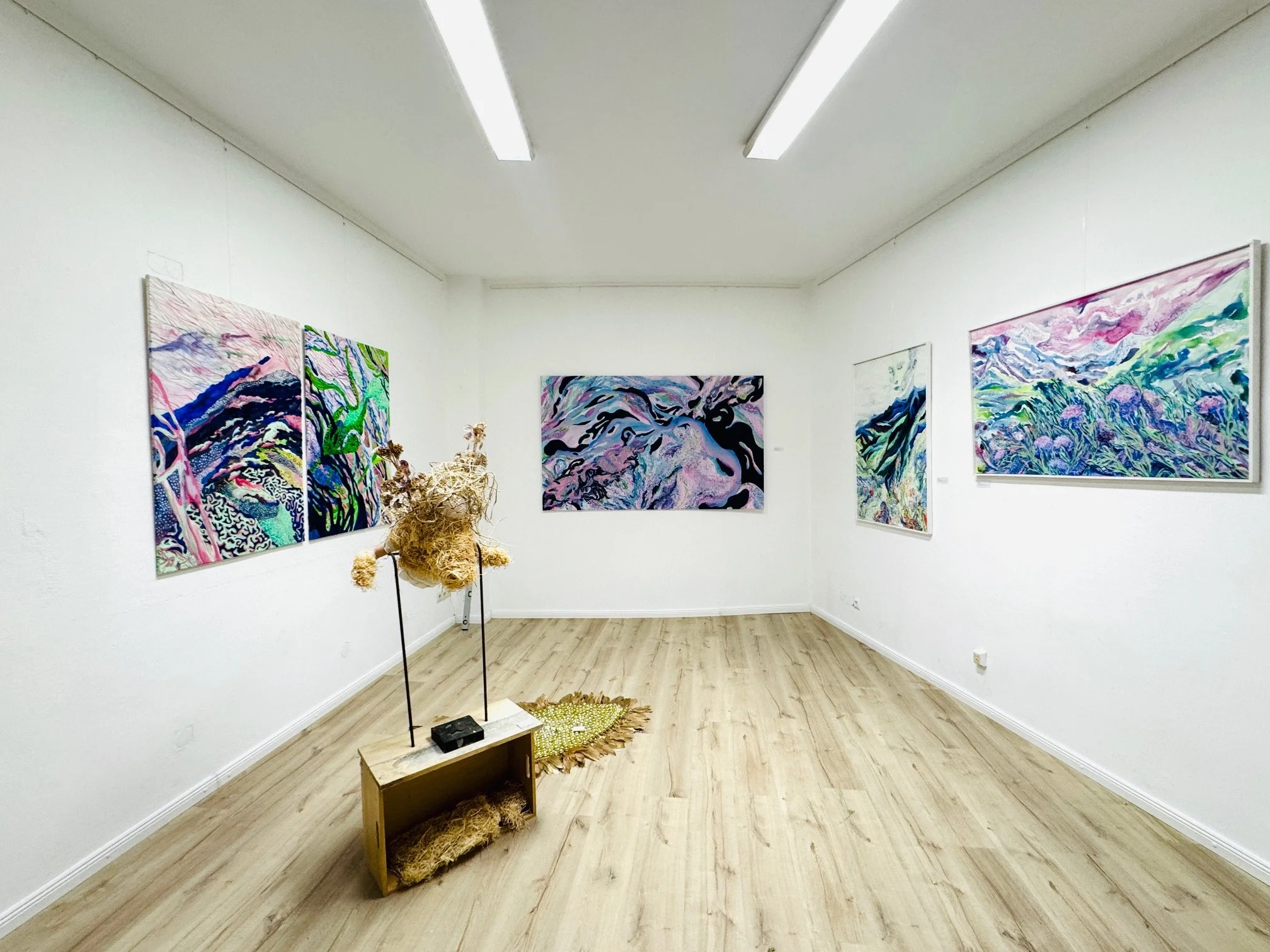 The fusion of techniques and materials — straw puppets, embroidery, acrylic paintings, and watercolor — showcases the richness of our world and sparks curiosity about everyday life.
