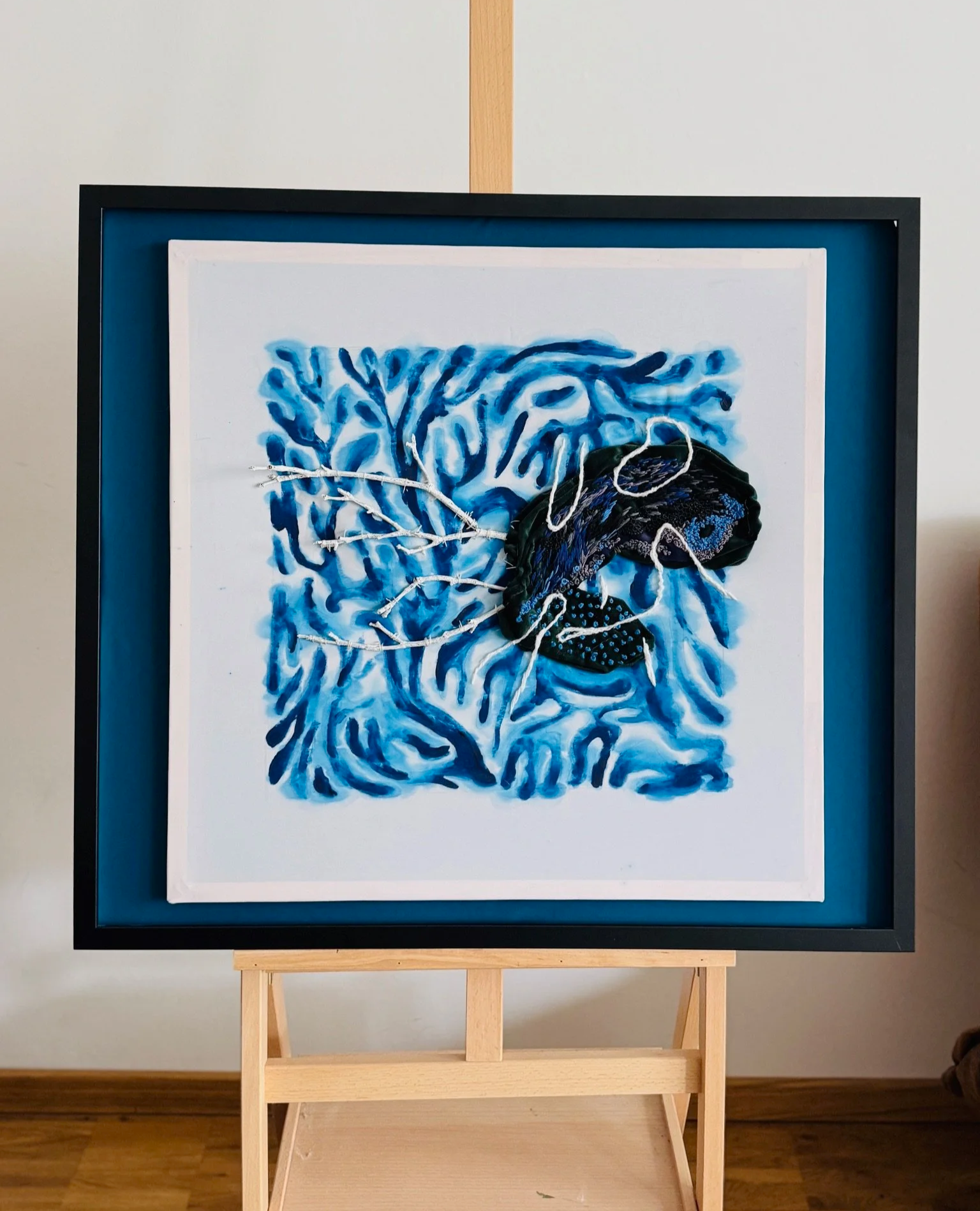 The diptych "Nabokov" shows two butterflies with damaged wings, symbolizing Vladimir Nabokov’s life in Berlin. His experience of emigration brought feelings of loss, longing, and a search for identity. The paintings remind us of the struggles of exile, the fragile beauty of life, and the need to find meaning despite loss.